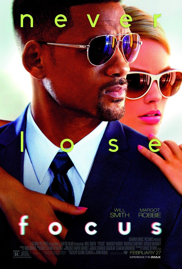 Will Smith fans, take note: your man is back and in top form in Focus, a shell game of a movie that will have you second-guessing yourself just about every time you think you know what's really going on. It's a movie about con artists and confidence schemes that's a con in and of itself, so if it pulls the wool over your eyes more than once, don't feel bad. You won't be alone, and getting fooled is part of the fun.